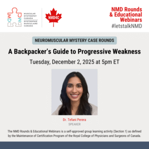 See the upcoming events from the NMD4C and Muscular Dystrophy Canada as a part of Let’s Talk NMDs series, as well as a collection of webinars, events, and conferences from around the neuromuscular community.